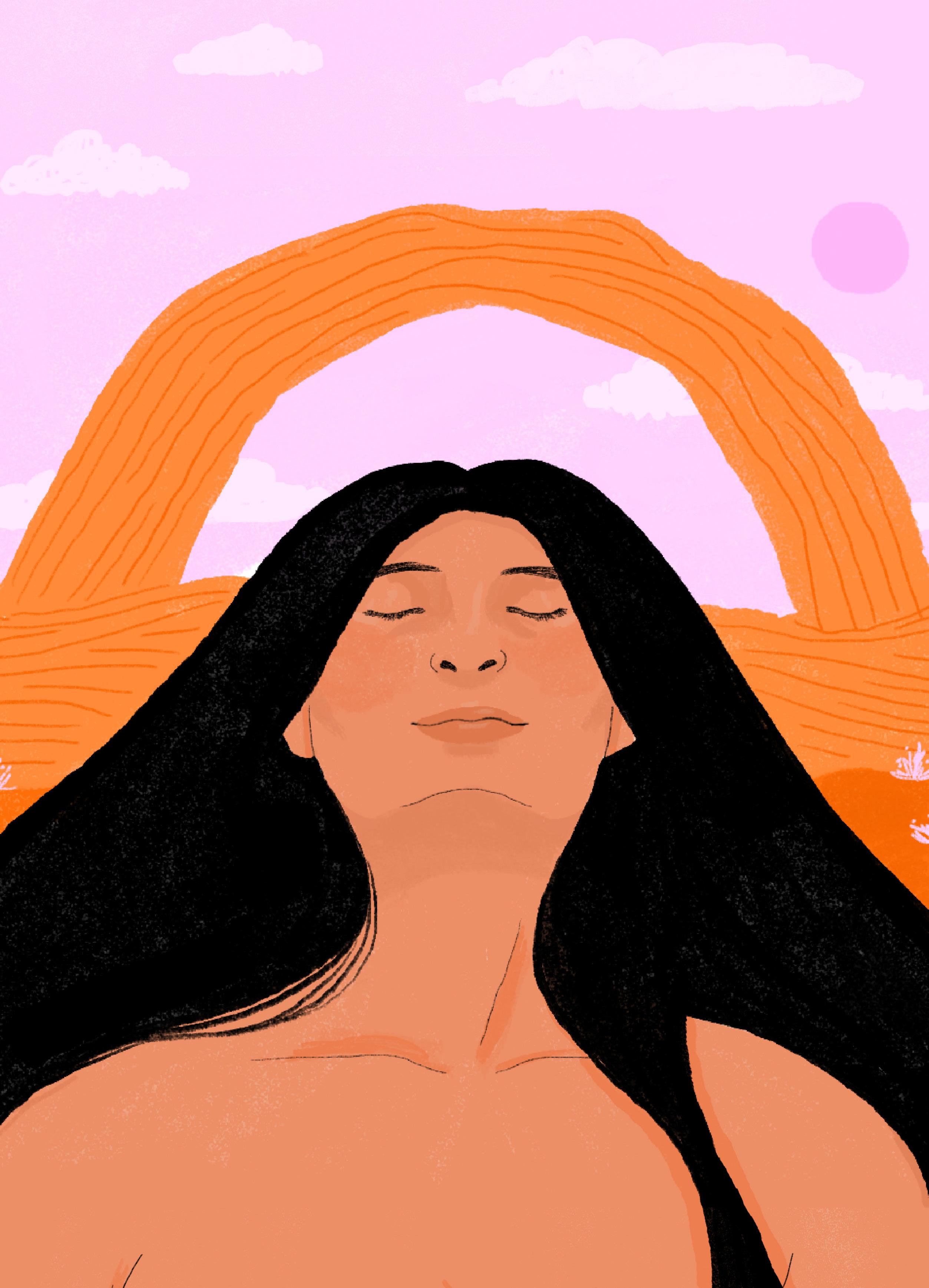 Lynne Hardy is a Diné artist based in Provo, Utah, and runs an online business called Ajoobaa’sani, selling products inspired by her culture. This illustration depicts an Indigenous woman enjoying nature, symbolizing Indigenous people’s connection to the land . @ajoobaasani / ajoobaasani.com About the Artist