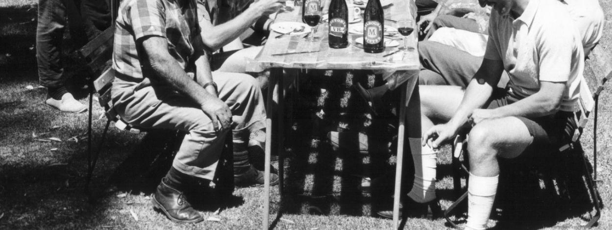 4) Man standing in front of the second of the two verandah posts with blue jumper - Glen McWilliam (Glen Maxwell McWilliam 3 Feb 1914, Manly – 30 May 1996, GBH. Innovative winemaker, talented pianist, pilot). Father of Ross, Max, Bette & Peter.