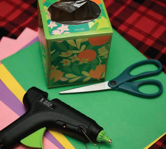 Glue the construction paper squares to all sides of the tissue box.