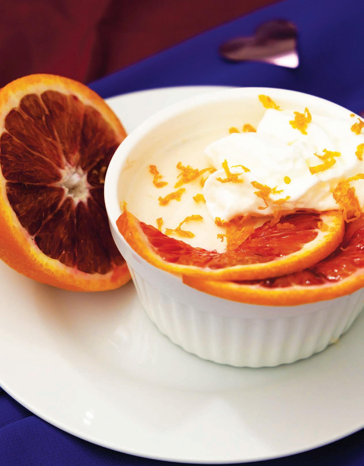 “This blood orange panna cotta offers a balance of creamy sweetness and bright citrus notes, perfect for a romantic dessert.”