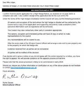 The CEO of WGHC (authorised by Committee) applied under the High Hedges (Scotland) Act 2013 due to the unacceptable and, potentially, dangerous height of the leylandii trees that border our estate. These trees affect the light to many WGHC tenant’s gardens, causing damp, dank, dark conditions. Equally, they drop many needles that block gutters and drains.