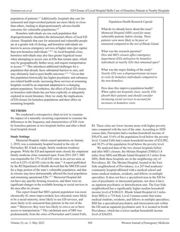METHODS We conducted a retrospective chart review to examine the impact of a naturally occurring experiment to examine the differences in the frequency and characteristics of ED visits by homeless patients at two hospitals before and after a third local hospital closed. Study Settings Memorial Hospital, which ceased operations on January 1, 2018, was a community hospital located in the city of Pawtucket, RI. It had a single, family medicine residency program. While the ED and inpatient units closed, the outpatient family medicine clinic remained open. From 2011-2017, MH was responsible for 37% of all ED visits in its service area, as well as 6.22% of all ED visits in the state.16 A report published by the RI Department of Health showed that the MH ED cared for a large portion of the state’s vulnerable population, and that its closure may have detrimentally affected the local population and remaining operational EDs.16,17 Memorial Hospital did not have any specific housing resources, and there were no significant changes in the available housing or social services in the area after its closure. This report found that MH’s patient population was more chronically ill, more impoverished, less educated, more likely to be a racial minority, more likely to use ED services, and more likely to be uninsured than patients in the rest of the state.16 Moreover, they were less likely to own a car or have access to transportation.16 The catchment area of MH was predominantly from the cities of Pawtucket and Central Falls, Volume 23, no. 3: May 2022