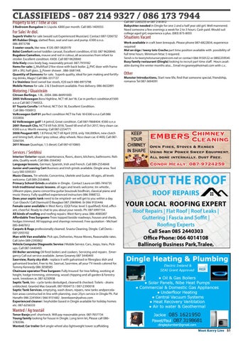Interior/ Exterior repair, maintenance, floors, doors, kitchens, bathrooms. Reliable, Quality work. Call 086-3564342 Language lessons, German, Spanish, Irish and French. Call 089-2554848 Junior and Leaving Cert Business and Irish grinds available. Dingle area. Text Lucy 083 0393351 Music Classes, Tin whistle, Concertina, Ukelele and Guitar. All ages, all levels welcome. Call 089-2554848. Primary School Grinds available in Dingle. Contact Laura on 085-7416735 Irish traditional music lessons. all ages and levels welcome. tin whistle , Uilleann pipes, piano concertina guitar bouzouki bodhrán, classical piano and music theory. Fully qualified experienced instructors 086 3988722. Does your septic tank need to be emptied- we will get to you within a day. Cuir Glaoch/ Call Diarmuid Ó Beaglaoi 087 2969846 0r 066 9155446 Female carer available in West Kerry. (QQI Fetac level 5 qualified). Kind, efficiant, cheerful. Ready to chat to you about your needs. Ph: 087 6997154. All kinds of roofing and roofing repairs. West Kerry area. 086-4085007 Affordable Tree Surgeons-Trees topped beside roadways, houses and sheds, hedges trimmed. All toppings and shavings removed. Free quotation - Michael 085-8487812 Carpets & Rugs professionally cleaned. Snasta Cleaning, Dingle. Call Denis 087-2055102 Man with Van available: Pick ups, Deliveries, House Moves, Reasonable rates. Call John 089-2393862 Vehicle Computer Diagnostic Service / Mobile Service. Cars, Jeeps, Vans, Pickups. Call 087-3440493 Oil Boiler servicing Oil fired boilers and cookers. Servicing and repairs . Emergency Call out service available. James Greaney 087 3440493 Saorview, Rusty sky dish - replace it with galvanised or fibreglass dish and galvanised bracket, Free to Air, Saorsat, Saorview, all your TV needs catered for. Tommy Kennedy 086 3058585 Chainsaw operator/Tree Surgeon: Fully Insured for tree felling, working at height, hedge trimming, strimming, wood chipping and all garden & forestry work. treedown.ie. 087 6230938 Septic Tank, bio - cycle tanks desludged, cleaned & checked. Toilets - drains unblocked. Gearóid Mac Gearailt. 087-9504713 / 087-2390018 Septic Tank Services, emptying, wash down, repairs, new tanks andpercolation areas constructed in line with planning. over 25yrs service in Dingle Ph. Pat Hanafin 086 2241064 / 066 9151682 . beenbawn@yahoo.com Experienced cleaner / keyholder based in Dingle available for holiday homes etc. 087-6256533