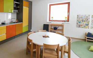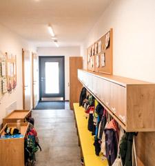 che Nutzung des Gebäudes vor, wodurch die Mischnutzung als Wohn- und Schulgebäude der Vergangenheit angehört. Bis auf das Erschlie ßungsbauwerk und das Tiefgeschoss fand der Umbau innerhalb des bestehenden Gebäudes statt. Der neue Kindergarten – vormals war er im Gemeindehaus – ist von der Südseite her barrie refrei zugänglich und verfügt über einen individu ell teilbaren Gruppenraum sowie einen separaten Ruhebereich. Des Weiteren befinden sich alle notwendigen Sanitär-, Büro- und Lagerräume des Kindergartens auf derselben Ebene. Eine riesige Sonnenterrasse dient als Spielfläche. Der östliche Teil des Obergeschosses, in dem sich derzeit die beiden Klassenräume der Volksschule befinden,