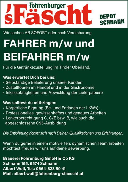 27. September 2022 47 Regionalität und Persönlichkeit zählt! Rauchfangkehrer CHRISTIAN STURM Ried im Oberinntal Tel. 0664 26 07 180 FEUERLÖSCHER-VERKAUF UND -WARTUNG Rieder Herbstmarkt 9. Oktober 2022 // ab 14 Uhr Schloss Sigmundsried TRANSPORTUNTERNEHMEN 6531 RIED Nr. 41 ERD- UND AUSHUBARBEITEN TELEFON 0 54 72 / 62 94 STEINBRUCH HANDY 0 664 / 131 61 64 FELS- UND SPRENGARBEITEN ried@erdbaupatscheider.at B AU - UND K UNSTGLASEREI SPENGLEREI - ISOLIERUNGEN ‰ Spezielle Systeme für Bad- und Duschverglasungen, Glastrennwände, Fassadenverglasungen ‰ Prefa-Bedachungen, Fassadensysteme in Aluminium A-6531 Ried 230 Tel. 05472 - 6969 Fax: DW 50 info@zerzer.net