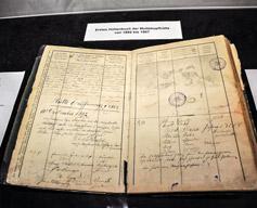 12 Das erste Hüttenbuch der Mutte kopfhütte von 1892 mit Einträgen von der Eröffnung der Hütte.