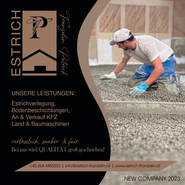 ne umfassende Erfahrung bezieht sich nicht nur auf alle Arten von Estrichen, sondern schlieĂt wichtige Kenntnisse ĂŒber SchalldĂ€mmung und WĂ€rmeleitfĂ€higkeit mit ein. Aus persönlicher Ăberzeugung setzt er auf nachhaltige, klimafreundlich erzeugte Materialien und auf ein gutes CO2-Effizienz-Management bei der Arbeit. Auch mit den nötigen GerĂ€ten fĂŒr die maschinell gefertigten Estriche ist er bestens ausgerĂŒstet und kann sie als gelernter KFZTechniker, der zusĂ€tzlich einen Autohandel betreibt, selber warten. Bei Bedarf organisiert Patrick Franzelin fĂŒr Selfmade-Kunden auch Putz- und Estrichmaschinen sowie Kompressoren.