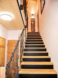 richtet, wo auch einige Möbelstücke für das Haus entstanden sind. Hier parkt auch der Traktor, der bei der Stallarbeit des Nebenerwerbsbauers (15 Goaßen und zwei Haflinger) im Einsatz ist. Eine eigene Schmutzschleuse mit Umkleide sorgt für einen »sauberen« Übergang von der Arbeit zum Privatleben, in der großen Waschküche gegenüber kann die Schmutzwäsche gleich erledigt werden. Über eine Holztreppe mit schmiedeeisernem Geländer gelangt man in das Obergeschoss mit etwas