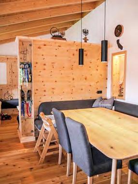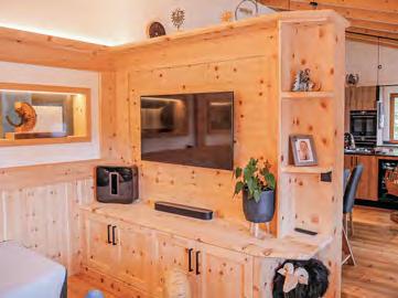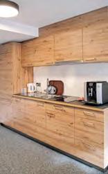 über 100 m2 Wohnfläche und damit in den Wohnbereich der vierköpfigen Familie. Von einer Galerie aus betritt man das großzügige »Kommunikationszentrum«. Die Wohnküche mit Fronten in Eichenoptik und Steinarbeitsplatte in Anthrazit verfügt über einen versenkten Dunstabzug für den freien Durchblick und zwei Highlights: Ein eigener Weinkühlschrank und ein beleuchteter Barschrank weisen auf die Gastfreundlichkeit des Paares hin. Familie und BesucherInnen lassen sich gerne am angrenzenden großen Esstisch nieder. Hinter (selbstgetischlerten) Trennwänden und Vitrinen in Zirbe kann sich die Familie im kuscheligen Wohnzimmer auf selbstdesignten Couchen mit viel Liegefläche entspannen. Der vorgelagerte Westbalkon bietet Ausblick ins Grüne, einen Essbereich