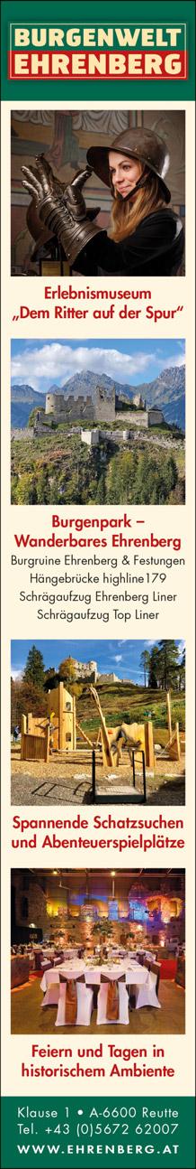 Ein Ort der Begegnung, der einen Bogen vom Mittelalter bis in die Gegenwart spannt Einst eine mächtige Verteidigungsanlage, ist mit der Burgenwelt Ehrenberg ein Ort der Begegnung entstanden, der auf interessante und vielfältige Weise Einblicke in die Geschichte Tirols gewährt und zugleich ein spannendes Ausflugsziel für die ganze Familie darstellt.