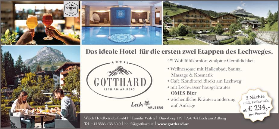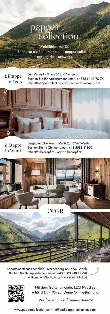 im moderaten Level. So genießen auch Ambitionierte die Highlights entlang der Strecke, die durch zwei Länder und fünf Regionen führt, ganz entspannt. Diese reichen von den bayerischen Königsschlössern über das Vogelparadies Pflach bei Reutte und die spektakuläre Holzgauer Hängebrücke im Tiroler Lechtal bis hin zum urigen Walserdorf Warth. Das Finale furioso schließlich markiert der Vorarlberger Formarinsee, wo der Lech entspringt - mit Möglichkeit zur Verlängerung des Wanderurlaubs in der Arlberg-Region.