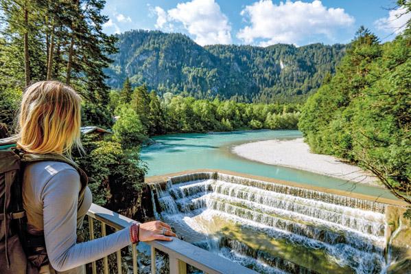 7Tosendes Finale am Lechfall: Das zwölf Meter hohe Stauwehr am südlichen Ende von Füssen bildet den imposanten Abschluss des Lechwegs und zählt zu den schönsten Geotopen Bayerns. Nach Regenfällen wird der Lechfall zur reißenden Wasserwalze, bevor der Fluss in der Schlucht verschwindet.