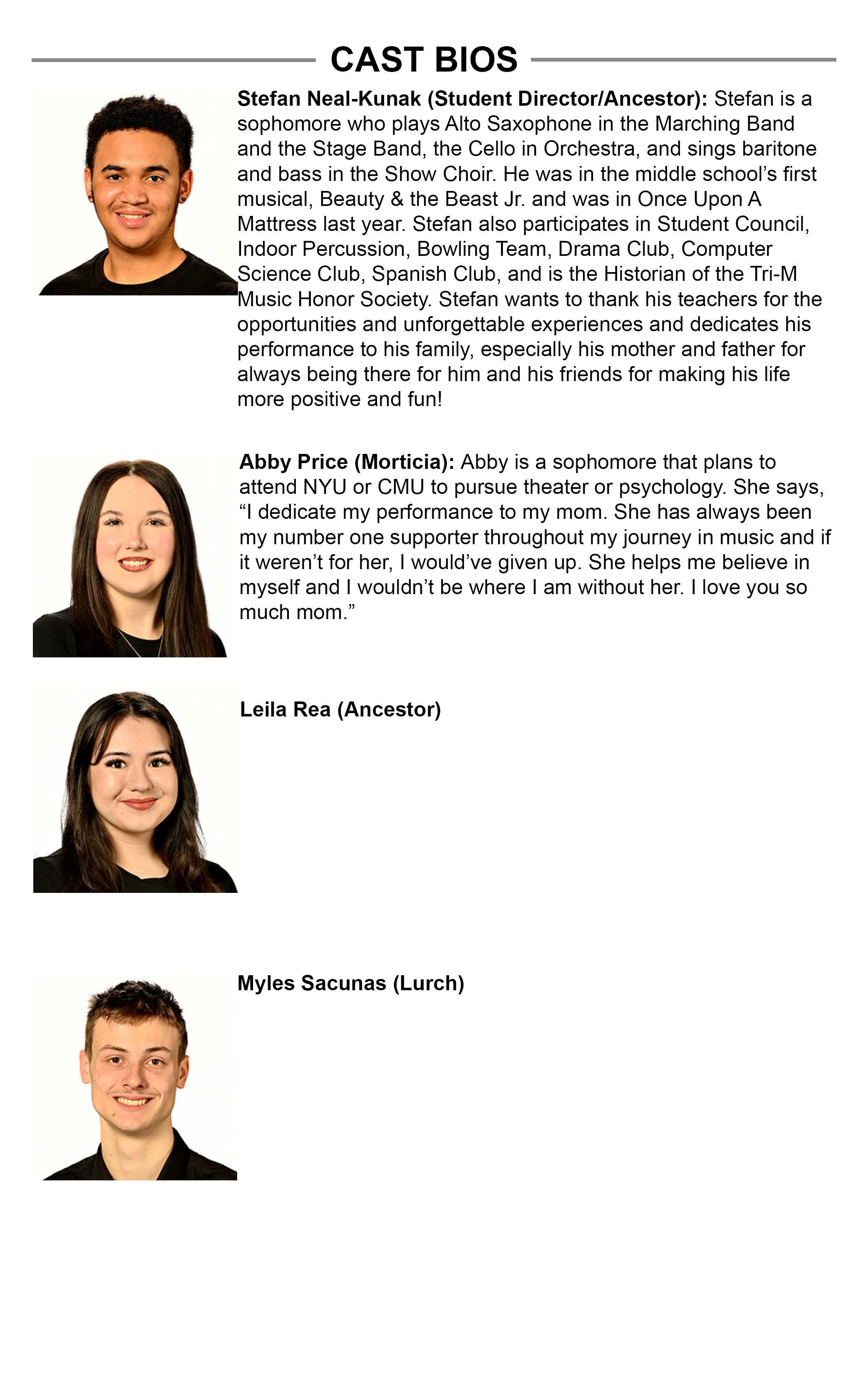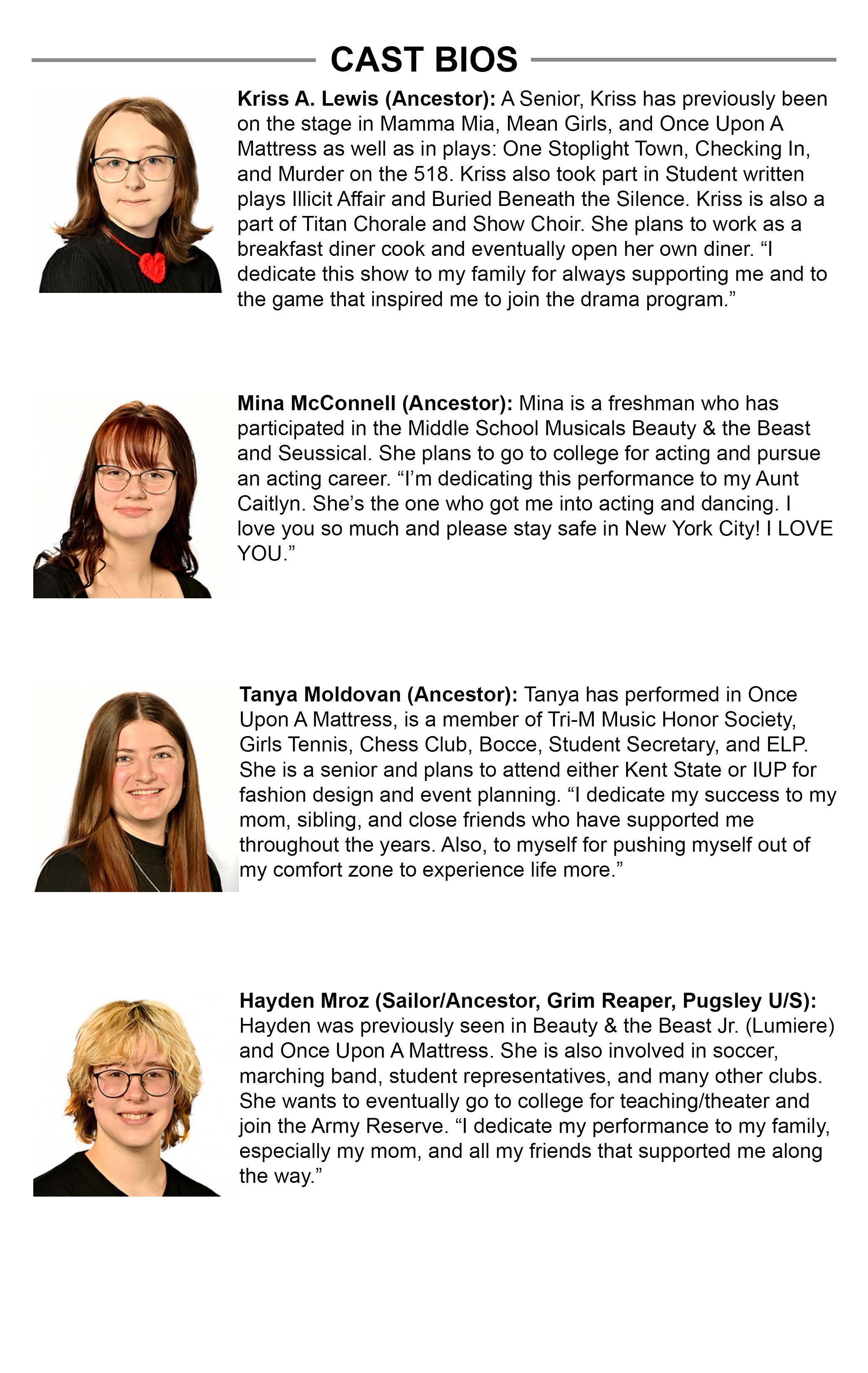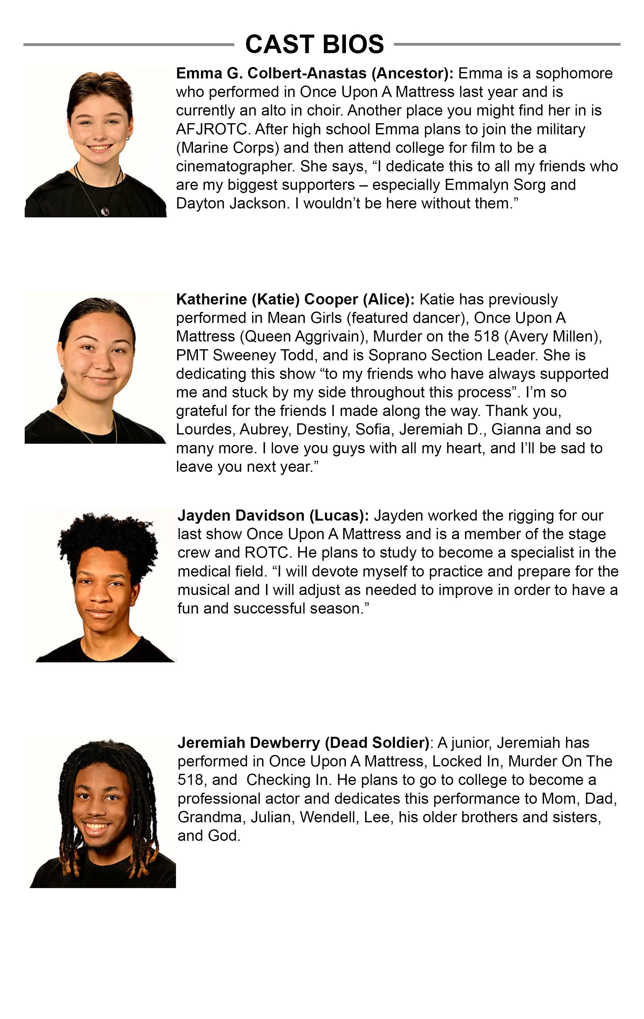 Ancestors Mia Black, Briya Carpenter, Victoria Carroll-Pierce, Riley Cochenour, Emma Colbert-Anastas, Jeremiah Dewberry, Gianna Doswell, Lourdes-Sarai Doswell, Pablo Franco, Lilah Hamilton, Aubrey Holmes, Olivia Kier, Destiny Lewis, Kriss Lewis, Mina McConnell, Hayden Mroz, Tanya Moldovan, Stefan Neal-Kunak, Leila Rae, Emmalyn Sorg, Taylor Wilson, Charlton Wright