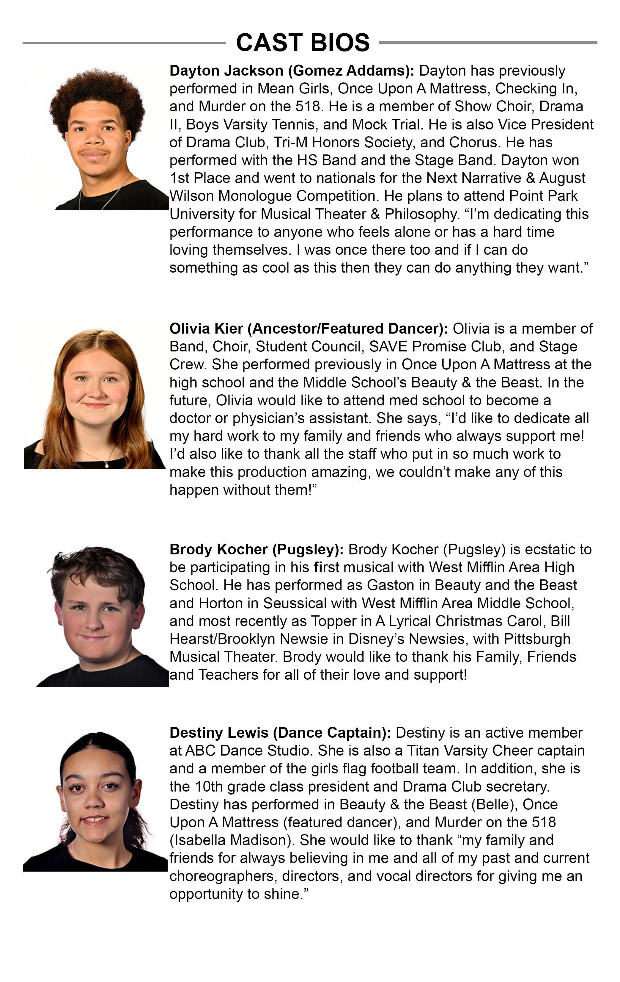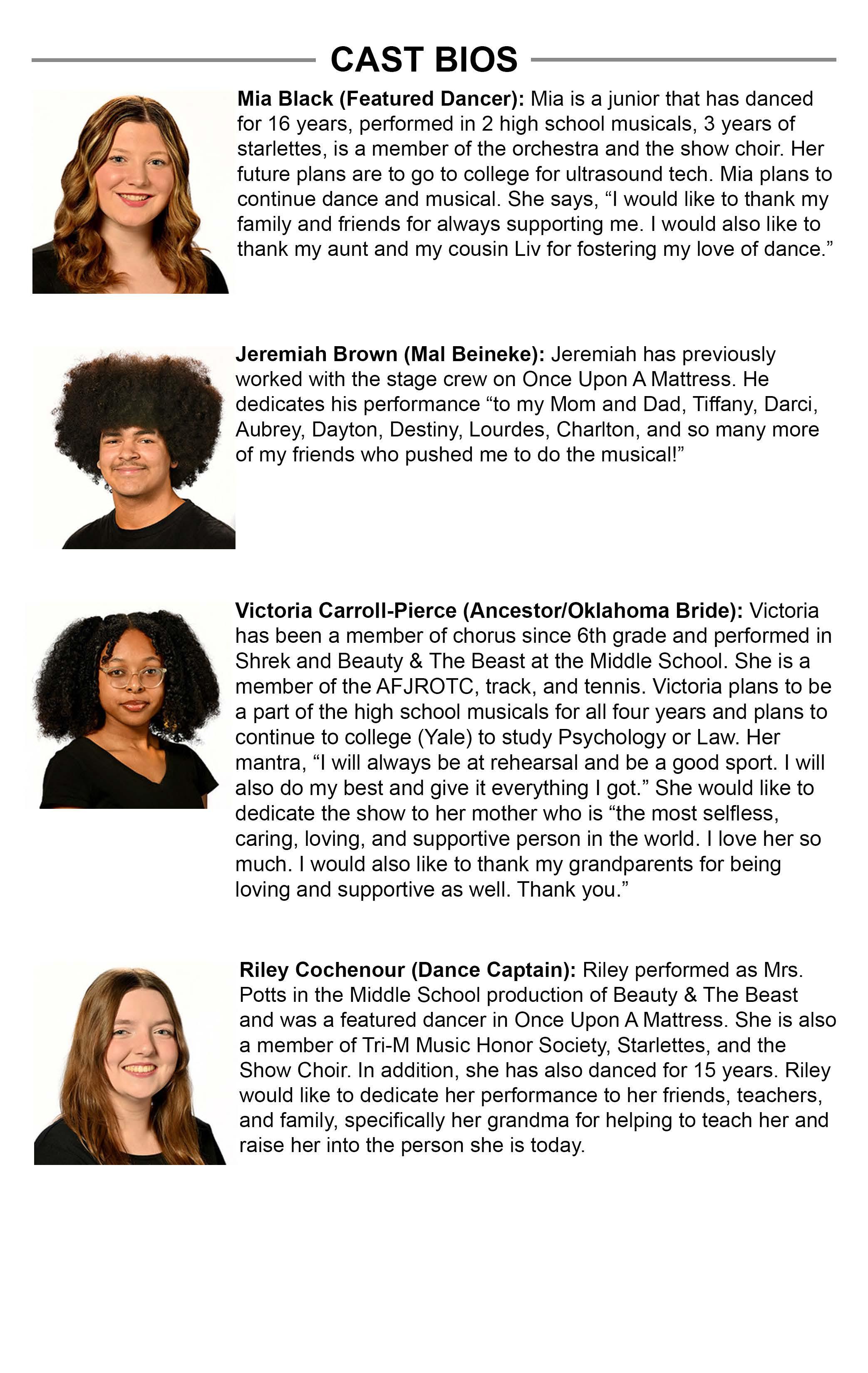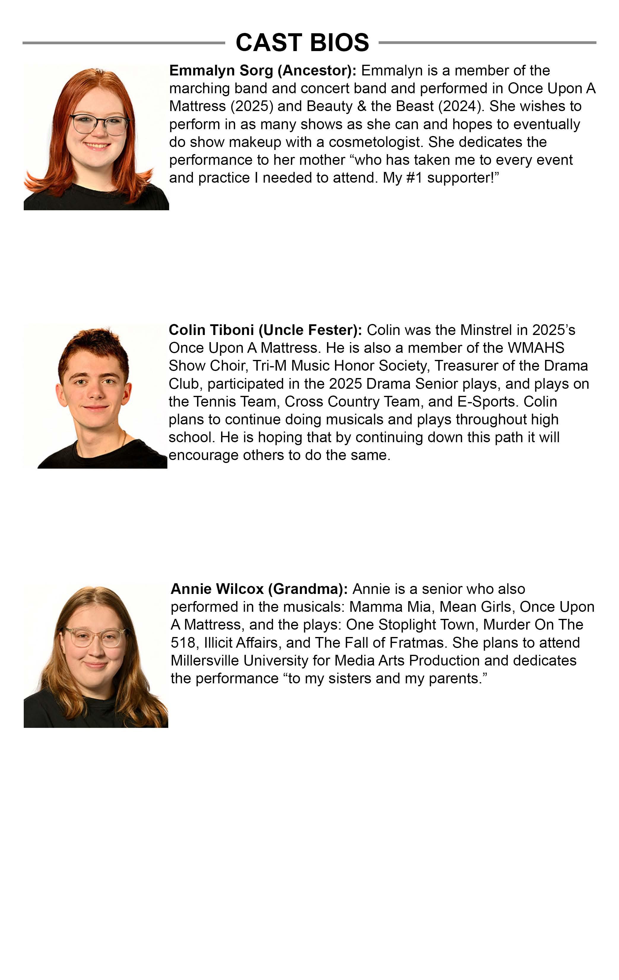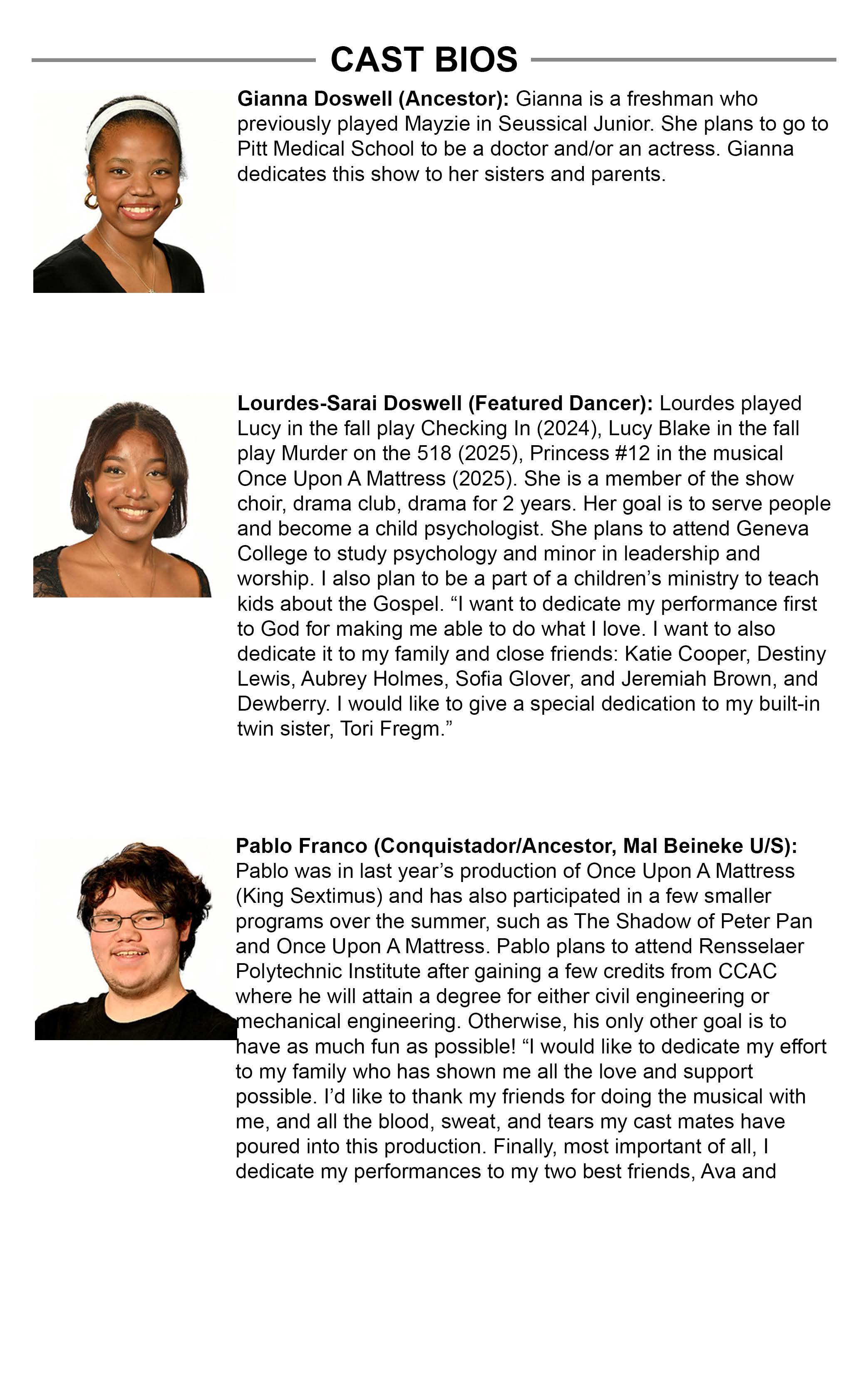 Ancestors Mia Black, Briya Carpenter, Victoria Carroll-Pierce, Riley Cochenour, Emma Colbert-Anastas, Jeremiah Dewberry, Gianna Doswell, Lourdes-Sarai Doswell, Pablo Franco, Lilah Hamilton, Aubrey Holmes, Olivia Kier, Destiny Lewis, Kriss Lewis, Mina McConnell, Hayden Mroz, Tanya Moldovan, Stefan Neal-Kunak, Leila Rae, Emmalyn Sorg, Taylor Wilson, Charlton Wright