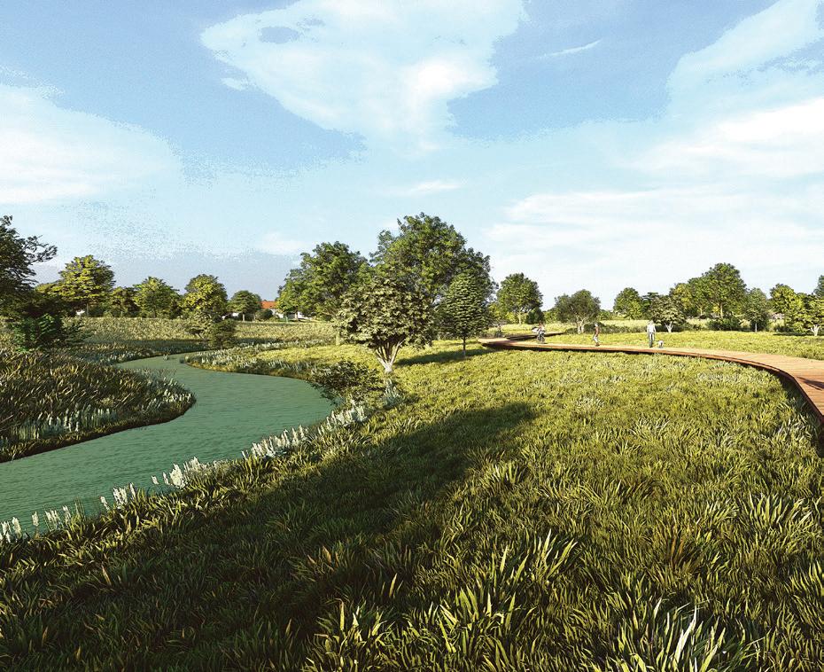 It will take several years for the plants and trees to become fully established. Although they may appear sparse initially, they will eventually develop into a thriving landscape. To safeguard the young plants as they grow, you might notice fencing around the base of trees and colorful flags blowing in the wind for protection from waterfowl. As an example of what to expect, visit the park area at Westminster Station. This space just north of 68th Avenue between Lowell and