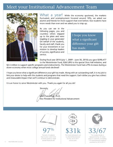 During fiscal year 2010 (July 1, 2009 – June 30, 2010) you gave $590,477 to the Westminster Fund, $261,895 to the special Sloss Hall initiative, and $2.5 million to support specific programs and endowments. The Westminster Fund had a 9% increase during a down economy when most college annual funds declined! I hope you know what a significant difference your gift has made. Along with an outstanding staff, it is my job to link your desire to help with the students and programs that need the support. Each dollar you give has a direct and measurable impact that we’ll continue to demonstrate. It is an honor to serve Westminster with you. Thank you again for all you do! Sincerely,