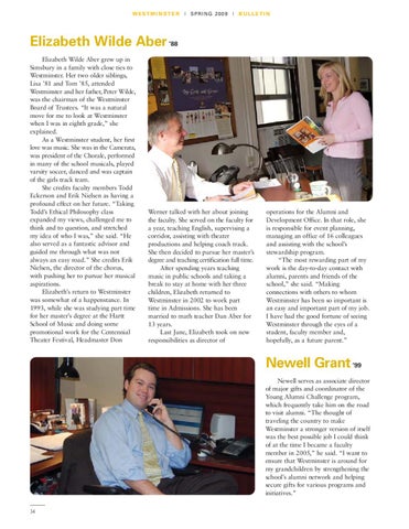 Elizabeth Wilde Aber ’88 Elizabeth Wilde Aber grew up in Simsbury in a family with close ties to Westminster. Her two older siblings, Lisa ’81 and Tom ’85, attended Westminster and her father, Peter Wilde, was the chairman of the Westminster Board of Trustees. “It was a natural move for me to look at Westminster when I was in eighth grade,” she explained. As a Westminster student, her first love was music. She was in the Camerata, was president of the Chorale, performed in many of the school musicals, played varsity soccer, danced and was captain of the girls track team. She credits faculty members Todd Eckerson and Erik Nielsen as having a profound effect on her future. “Taking Todd’s Ethical Philosophy class expanded my views, challenged me to think and to question, and stretched my idea of who I was,” she said. “He also served as a fantastic advisor and guided me through what was not always an easy road.” She credits Erik Nielsen, the director of the chorus, with pushing her to pursue her musical aspirations. Elizabeth’s return to Westminster was somewhat of a happenstance. In 1993, while she was studying part time for her master’s degree at the Hartt School of Music and doing some promotional work for the Centennial Theater Festival, Headmaster Don