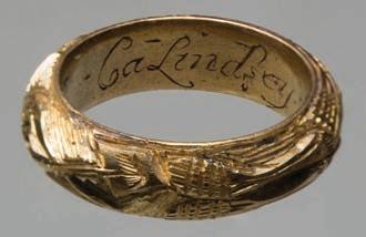 The second discovery is a small gold ring, dating from the early 18th century. On its inside is a short inscription, which indicates that it was a mourning ring commemorating Ca. Lindsey who died in 1722. Some initial research by our archaeologists suggested that the deceased might be Catherine Lindsey, wife of Richard Lindsey, Merchant. Catherine’s burial, alongside her daughter Mary, in the chancel of St Dionis Backchurch, City of London on 21 June 1722 is recorded in the church’s register. Mary was both born and baptised on 10 June and we know from the mourning ring that Catherine was aged just 28 when she died, three days later. Their deaths emphasise what a dangerous event labour could be for