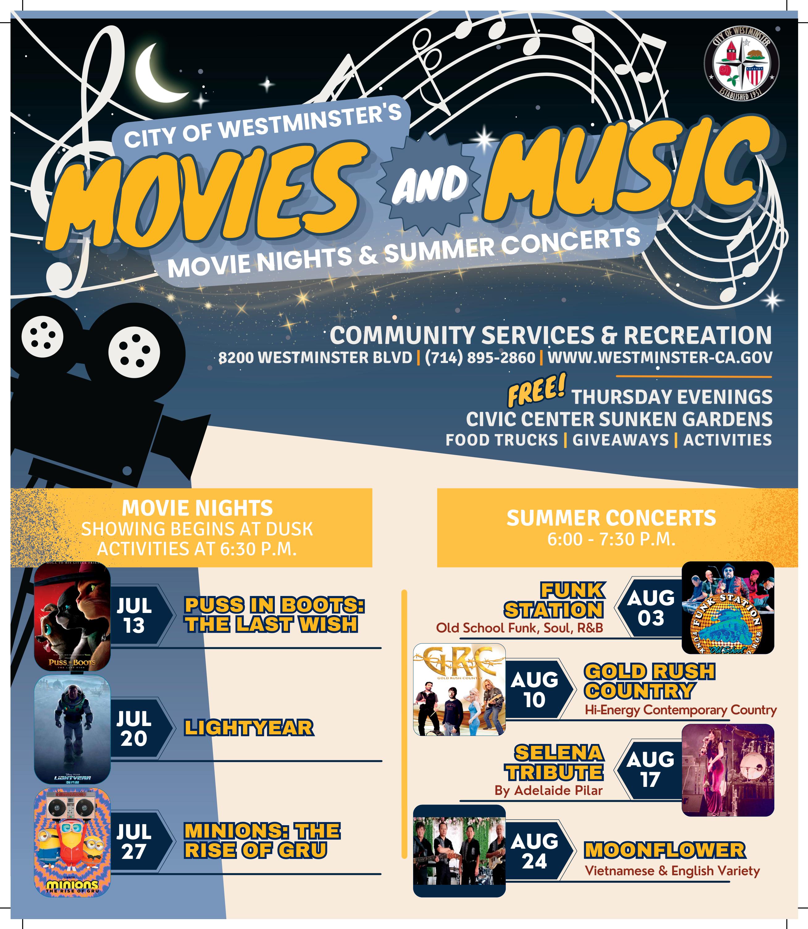Bring your friends and family out to enjoy a free night full of fun and entertainment! Sing and dance along to one of the many talanted bands that will be performing this year or sit back, relax and watch one of the family friendly movies that will be screening. Local food trucks will be on hand to provide food and beverages for purchase. Games and activities will be availible for kids.