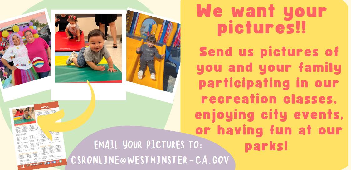 This free, educational event provides children and their families an opportunity to become familiar with the City’s safety staff and services. In addition, there will be displays and exciting demonstrations by the Westminster Police Department and the Orange County Fire Authority. For more information, please call the Community Services and Recreation Department at (714) 895-2860 or visit our website at www. westminster-ca.gov.
