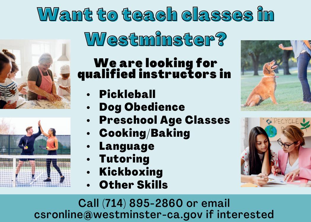 For event details and updates, please contact the Community Services & Recreation Department at (714)895-2860 or visit westminster-ca.gov