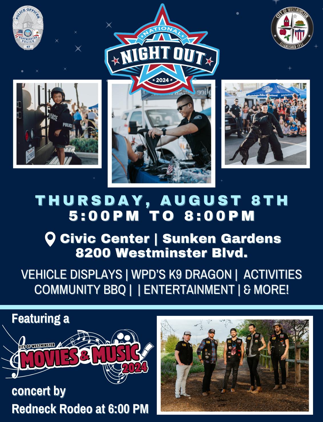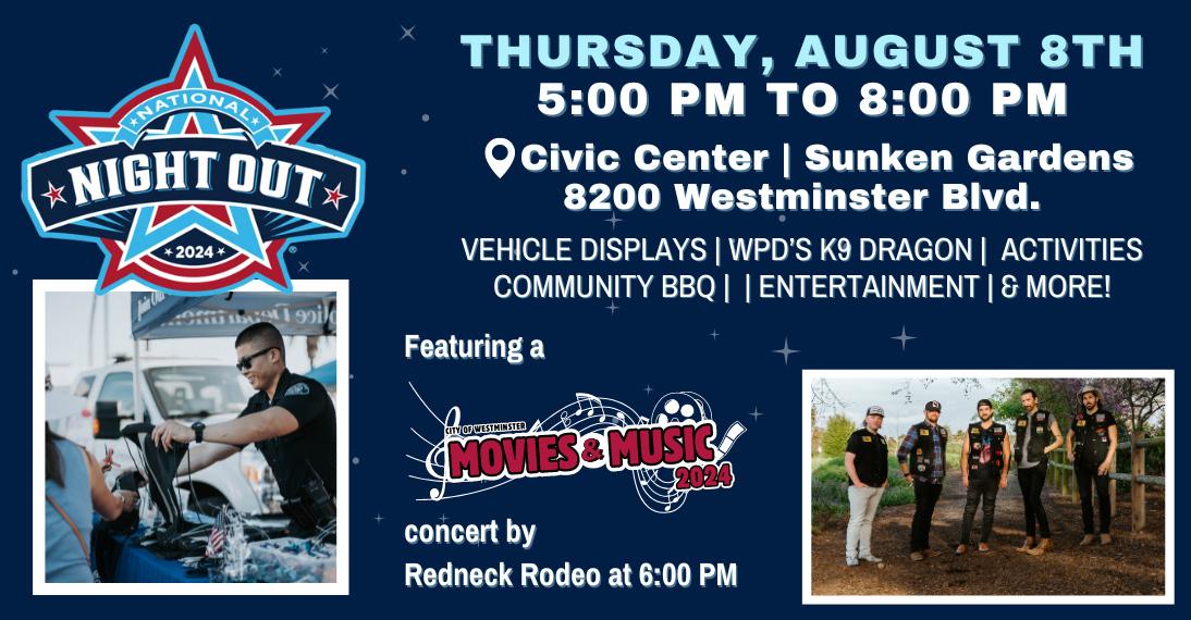 Join our Westminster Police Department on Thursday, August 8th from 5:00 p.m. - 8:00 p.m. for a night of fun with your community! This year’s event features a community BBQ and concert by Redneck Rodeo, in collaboration with 2024 Summer Movie & Music Nights.