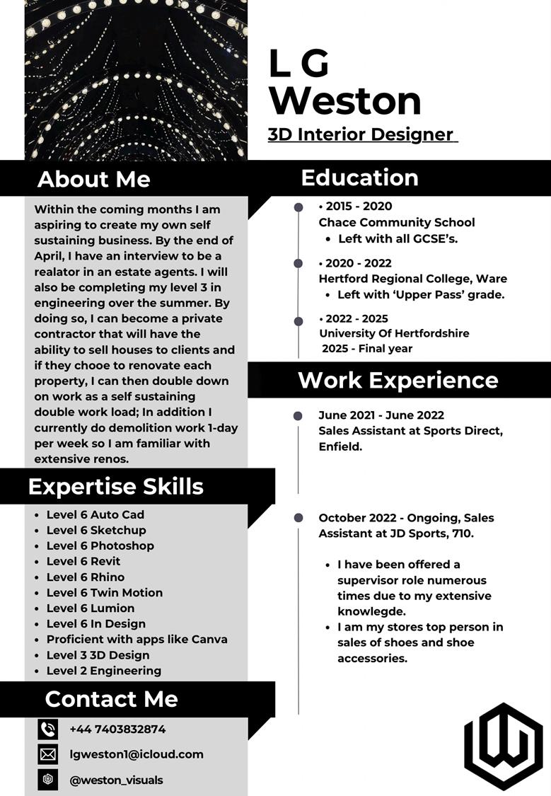 I am currently studying ‘Interior Architecture & Design’ at the ‘University of Hertfordshire.’ I am taking this path as I would like to be able to pursue this as my future career one day.
