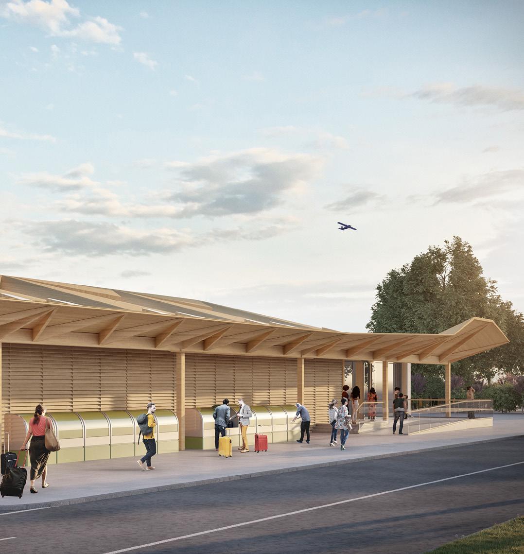 We challenged conventional thinking in construction, DfMA principles of prefabrication and modular design minimise construction waste to landfill. Excavated materials for the terminal site are incorporated into the landscape, creating interesting features that support the wellbeing of staff and passengers. The terminal is designed to minimise energy consumption by utilising natural daylight and ventilation: the main roof creates a series of tall spaces for stack ventilation and passive cooling. Extensive glazed facades and skylights provide natural light reducing the need for artificial lighting, and large overhanging eaves provide shading and reduce solar heat gain. Natural building materials with low embodied energy and carbon are locally sourced to reduce transportation costs and carbon emissions.