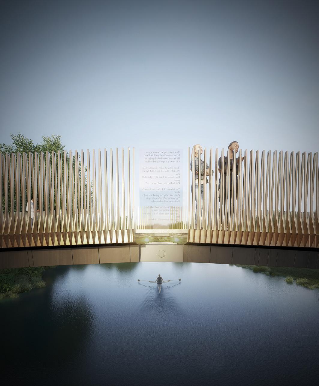 Our design is a clever three girder cantilever design giving a view through the bridge structure to the river below while also providing a place for pause and reflection before entering the Memorial Garden.