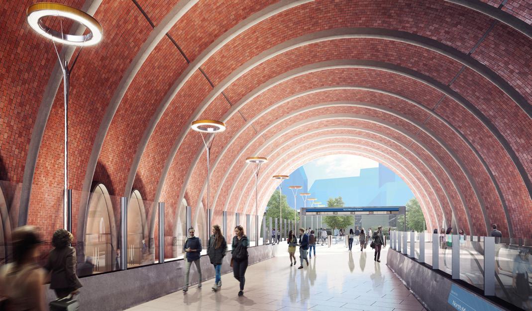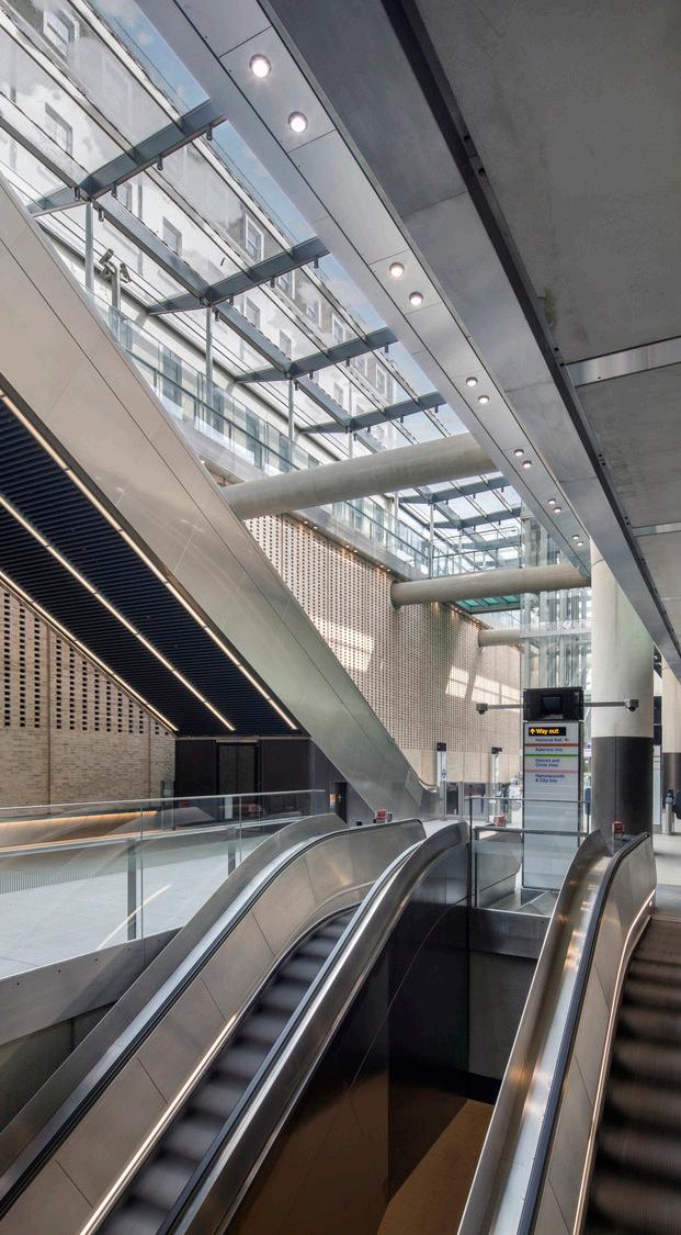 Vertical circulation and passenger movements were rationalised in order to create a relaxed, intuitive passenger experience. Feature walls draw users towards key points of exit and entrance whilst the soffit within the station box increases in volume at decision points.