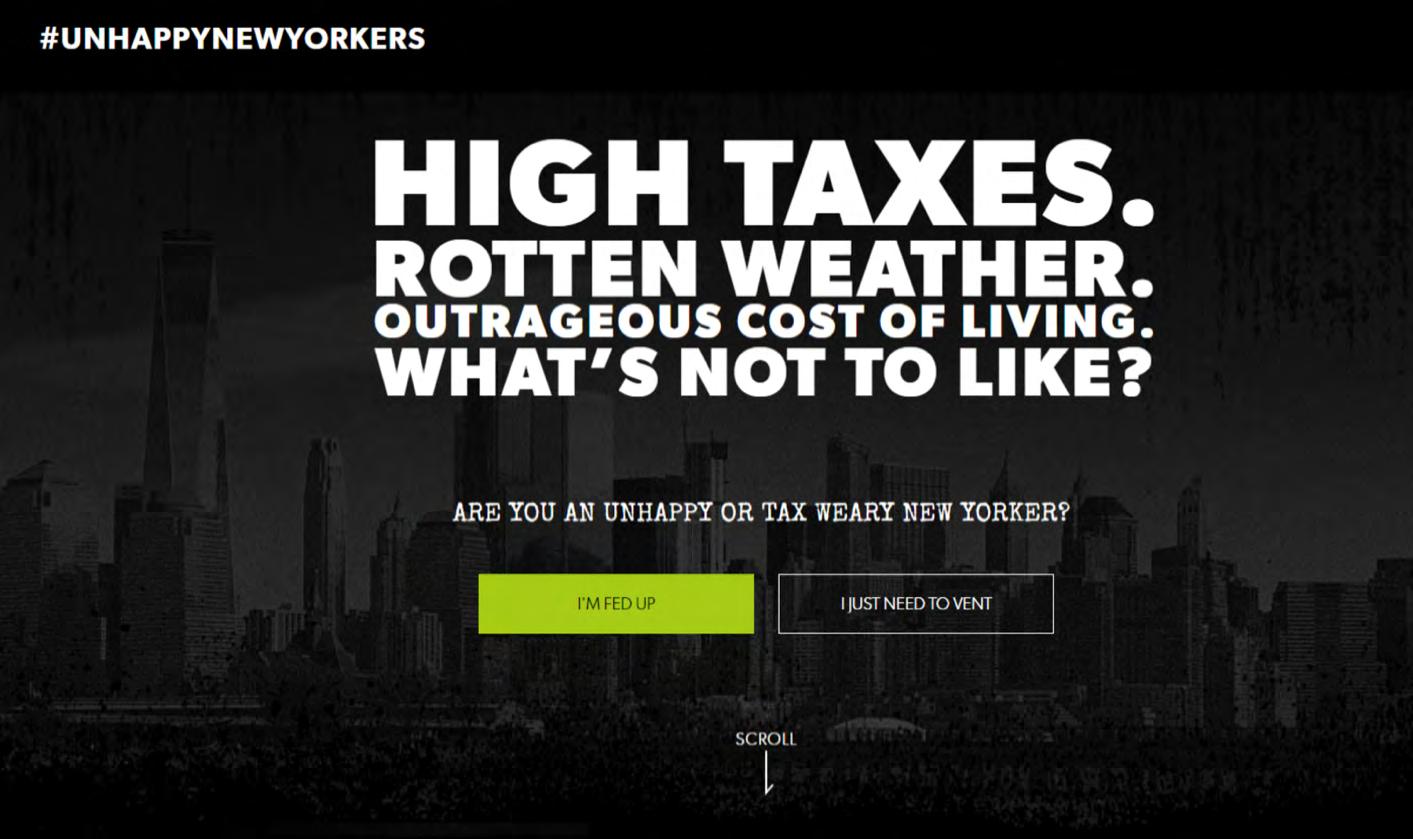 Poke fun at the political establishment by creating a website for “Unhappy New Yorkers” where they could download a resignation letter, rant on social media or fill out a form to find a new home in Downtown Doral.