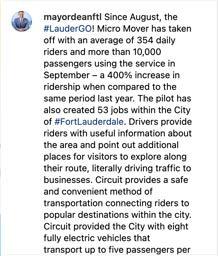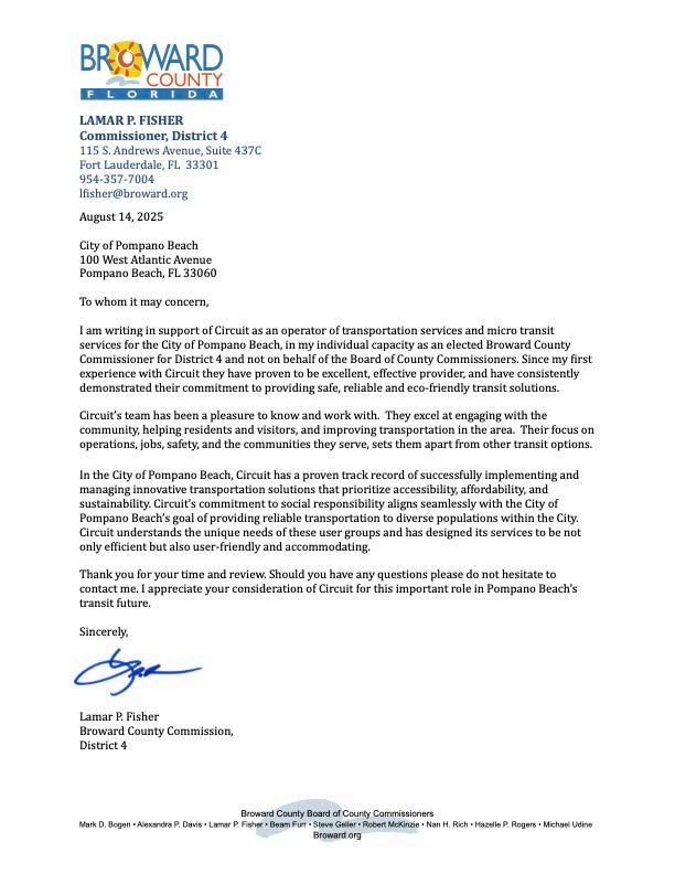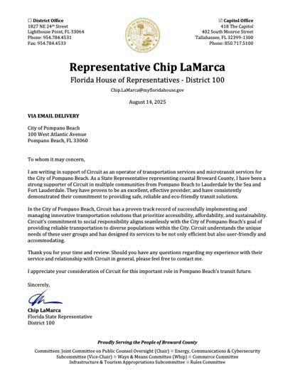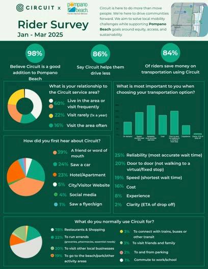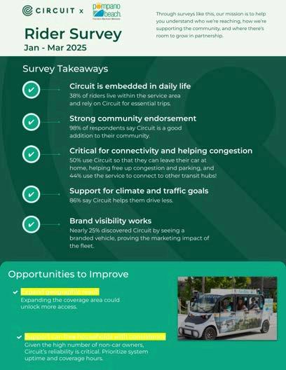 Esposito presented an update to the Board on Circuit, noting continued strong ridership while balancing total riders, wait times, and connection rates. In December, ridership exceeded 13,000 riders for the month. Esposito also highlighted a significant reduction in emissions within the downtown area, supported by Circuit’s employee driver model, which includes both full-time and part-time drivers. Notably, 97% of drivers reside in Palm Beach County.