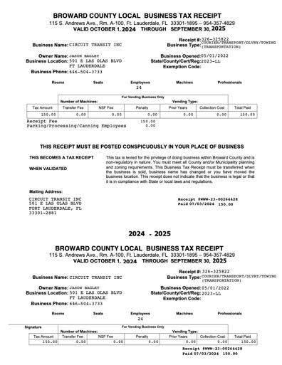 2.Bus Transit System. In accordance with Section 341.061, F.S., and Rule Chapter 14-90, Florida Administrative Code, the Agency shall submit and the Department shall have on file, an annual safety certification that the Agency has adopted and is complying with its adopted System Safety Program Plan pursuant to Rule Chapter 14-90, F.A.C., and has performed annual safety inspections of all buses operated.