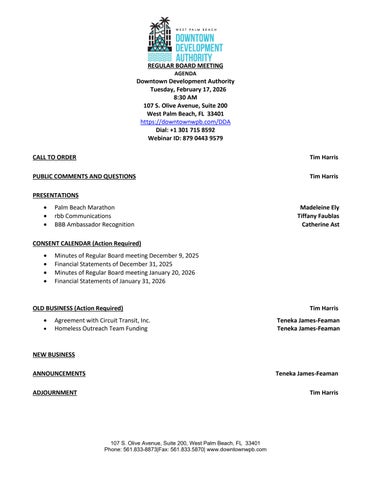 Tuesday, January 20, 2026, 8:30 AM 107 S. Olive Avenue, Suite 200 West Palm Beach, FL 33401 https://downtownwpb.com/dda/board-meetings/
