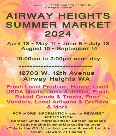 April 13 | Airway Heights Summer Market - 10 am to 2 pm. Fresh local produce, USDA meats, baked goods, food vendors and more. 12703 W 12th Ave