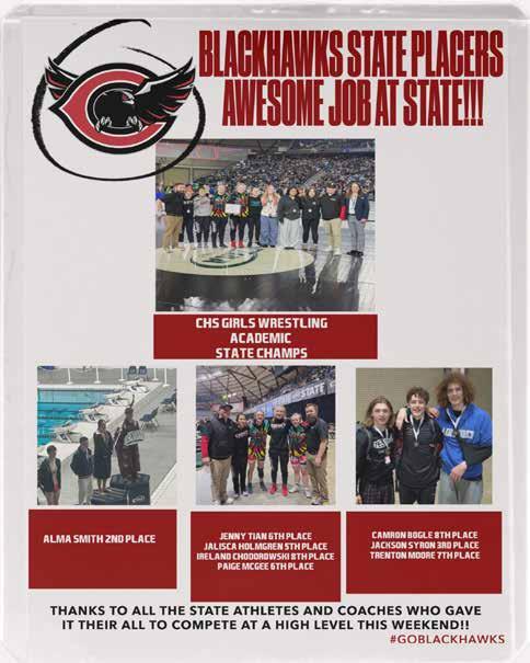 Cheney High School also saw success at the state level across multiple sports. The girls' wrestling team was recognized for their academic achievements, earning the title of Academic State Champions. Individually, Jenny Tian placed sixth in her division, Jalisca Holmgren finished fifth, Ireland Chodorowski took eighth, and Paige McGee also secured a sixth-place finish. On the boys’ side, Camron Bogle placed eighth, while Jackson Syron brought home a bronze medal with a third-place finish. Trenton Moore rounded out Cheney’s wrestlers with a seventh-place finish.