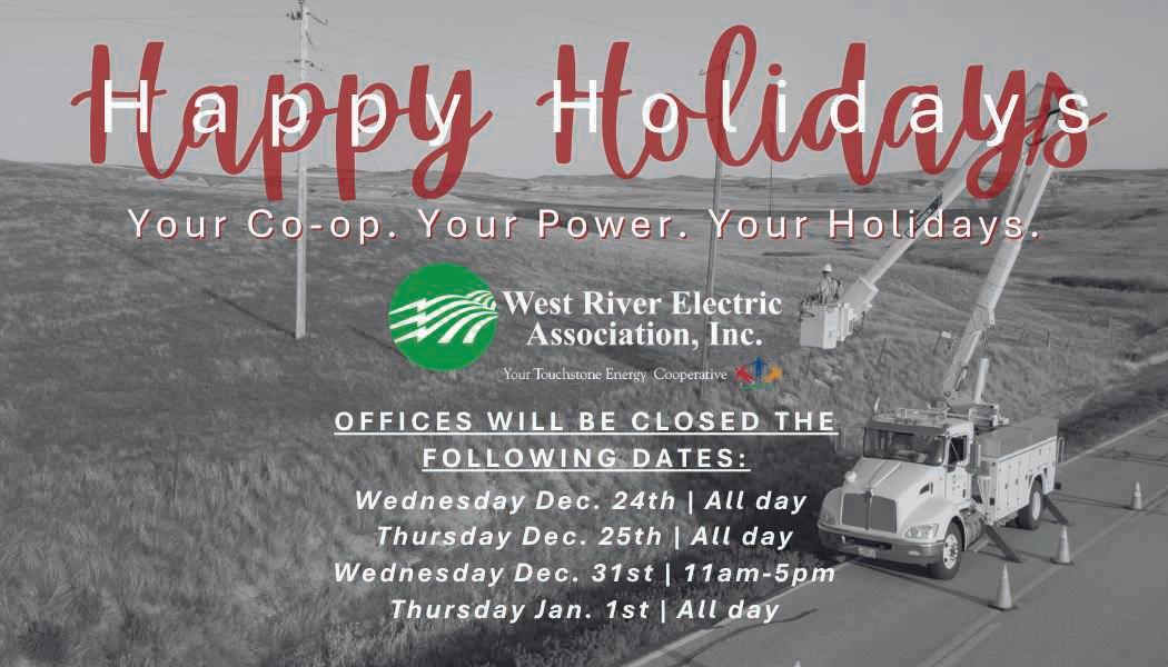 WEST RIVER ELECTRIC COOPERATIVE CONNECTIONS is the monthly publication for the members of West River Electric Association. Members subscribe to Cooperative Connections as part of their electric cooperative membership for $6 a year. West River Electric Cooperative Connections purpose is to provide reliable, helpful information to electric cooperative members on matters pertaining to rural electrification and better living. Nonmember subscriptions are available for $12 per year. Periodicals Postage paid at Wall, S.D., and at additional mailing offices. Postmaster: Send address changes to West River Electric Cooperative Connections, PO Box 412 , Wall, SD 57790-0412.