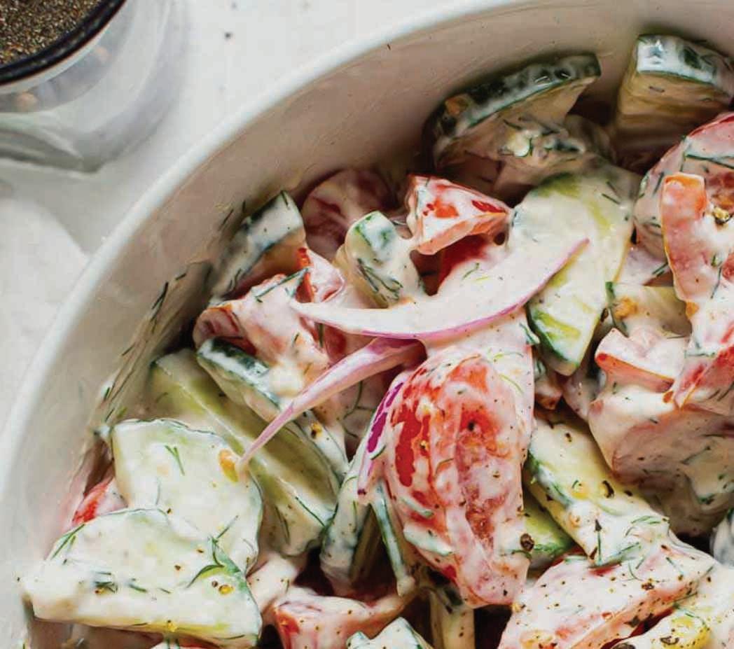 In a large bowl, add cucumbers, tomatoes, red onion, dill, garlic, sour cream, salt and pepper. Stir gently from the bottom in the center of the bowl until well combined. Serve salad within next six hours or so. ifoodreal.com