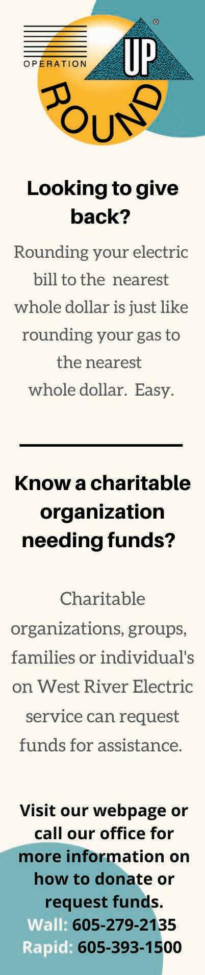 WEST RIVER ELECTRIC COOPERATIVE CONNECTIONS is the monthly publication for the members of West River Electric Association. Members subscribe to Cooperative Connections as part of their electric cooperative membership for $6 a year. West River Electric Cooperative Connections purpose is to provide reliable, helpful information to electric cooperative members on matters pertaining to rural electrification and better living. Nonmember subscriptions are available for $12 per year. Periodicals Postage paid at Wall, S.D., and at additional mailing offices. Postmaster: Send address changes to West River Electric Cooperative Connections, PO Box 412 , Wall, SD 57790-0412.