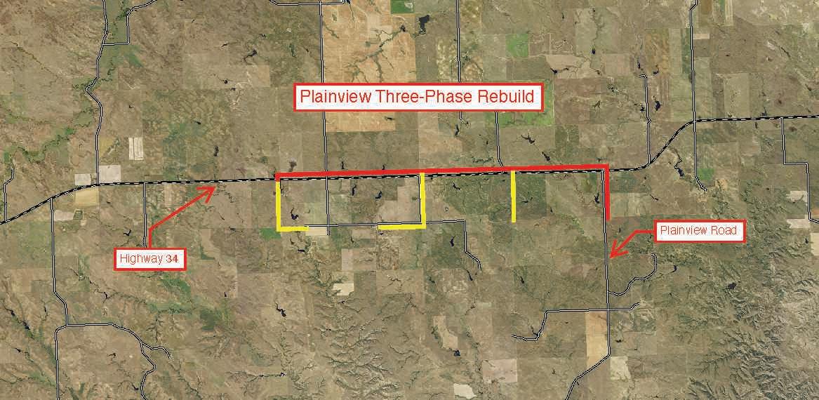 Please refer to the accompanying map that displays the areas designated for the rebuild. The red line indicates the location of the main three-phase line, while the yellow line represents the single-phase rebuilds. This map serves as a visual aid in understanding the scope of the reconstruction project. Should you have any questions, please give our office a call at 605-393-1500. 11489000
