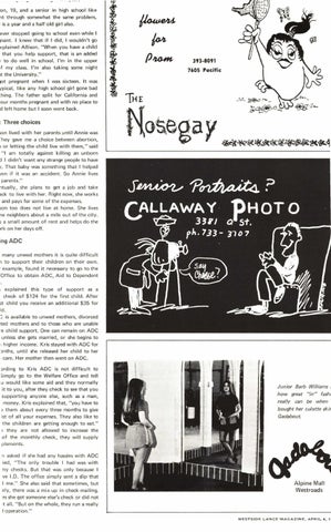 ; explained this type of support as a check of $124 for the first child. After st child you receive an additional $35 for Id. ::; is available to unwed mothers, divorced ted mothers and to those who are unable ·e child support. One can remain on ADC unless she gets married, or she begins to 1 higher income. Kris stayed with ADC for Jnths, until she released her child to her . care. Her mother then went on ADC. Jrding to Kris ADC is not difficult to )imply go to the Welfare Office and tell u would like some aid and they normally it to you, after they check to see that you supporting anyone else, such as a man, money. Kris explained that, "you have to > them about every three months to give ist of all your expenses. They also like to the children are getting enough to eat." 1 they are not allowed to increase the of the monthly check, they will supply plements. n asked if she had any hassles with ADC ied, "The only trouble I had was with ny checks. But that was only because I ve I.D. The office simply sent a slip that I me." She also said that sometimes, but ely, there was a mix-up in check-mailing. es she got someone else's check or did not 1t all. "But on the whole, they run a really I operation."