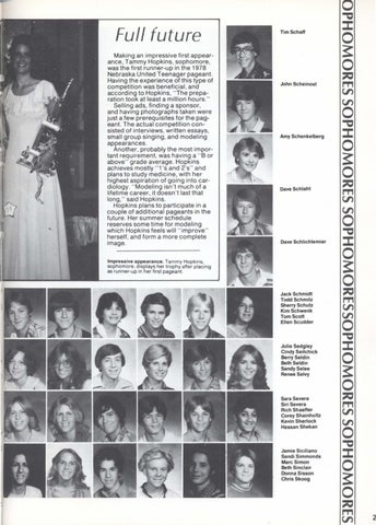 Full future Making an impressive first appearance, Tammy Hopkins, sophomore, was the first runner-up in the 1978 Nebraska United Teenager pageant. Having the experience of this type of competition was beneficial, and according to Hopkins, "The preparation took at least a million hours." Selling ads, finding a sponsor, and having photographs taken were just a few prerequisites for the pageant. The actual competition consisted of interviews, written essays, small group singing, and modeling appearances. Another, probably the most important requirement. was having a "8 or above" grade average. Hopkins achieves mostly "1's and 2's" and plans to study medicine, with her highest aspiration of going into cardiology. "Modeling isn't much of a lifetime career, it doesn't last that long," said Hopkins. Hopkins plans to participate in a couple of additional pageants in the future . Her summer schedule reserves some time for modeling which Hopkins feels will "improve" herself, and form a more complete image.
