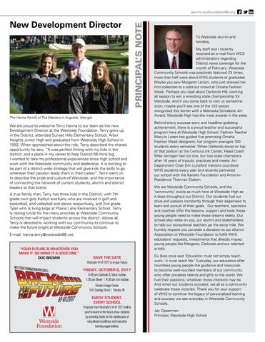 To Westside alumni and families, My staff and I recently received an e-mail from WCS administrators regarding District news coverage for the month of February. Westside Community Schools was positively featured 23 times; more than half were about WHS students or graduates. Maybe you saw Margaret Larson, who just showed her first collection to a sold-out crowd at Omaha Fashion Week. Perhaps you read about Darlondo Hill, working all season to win a wrestling state championship for Westside. And if you come back to visit us sometime soon, maybe you’ll see one of the 133 pieces recognized this winter with a Nebraska Scholastic Art Award; Westside High had the most awards in the state. Behind every success story and headline-grabbing achievement, there is a proud teacher and successful program here at Westside High School. Fashion Teacher MaryJo Losen has guided five promising Omaha Fashion Week designers; her program averages 100 students every semester. When Darlondo stood on top of that podium at the CenturyLink Center, Head Coach Mike Jernigan had not one, but two state champions after 16 years of tryouts, practices and meets. Art Department Chair Erin Lunsford mentors countless WHS students every year and recently partnered our school with the Kaneko Foundation and Artist-inResidence Therman Statom. We are Westside Community Schools, and the ‘community’ exists as much here at Westside High as it does throughout our District. Our students fuel our drive and passion constantly through their eagerness to learn and pursuit of their goals. Our teachers, sponsors and coaches offer the lessons, support and tools these young people need to make those dreams reality. Our school also relies on you, our alumni and stakeholders to help our exceptional teachers go the extra mile. We humbly request you consider a donation to our Alumni Association or Westside Foundation to fulfill WHS educators’ requests, investments that directly impact young people like Margaret, Darlondo and our talented artists. Du Bois once said ‘Education must not simply teach work - it must teach life.’ Everyday, our educators offer countless young people the guidance and resources to become well-rounded members of our community who offer priceless talents and gifts to the world. We fuel their passions, whatever those interests may be. And when our students succeed, we all as a community celebrate those victories. Thank you for your support of WHS to continue the legacy of personalized learning and success we see everyday in Westside Community Schools. Jay Opperman Principal, Westside High School