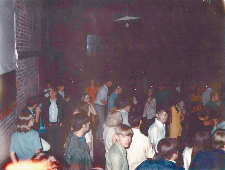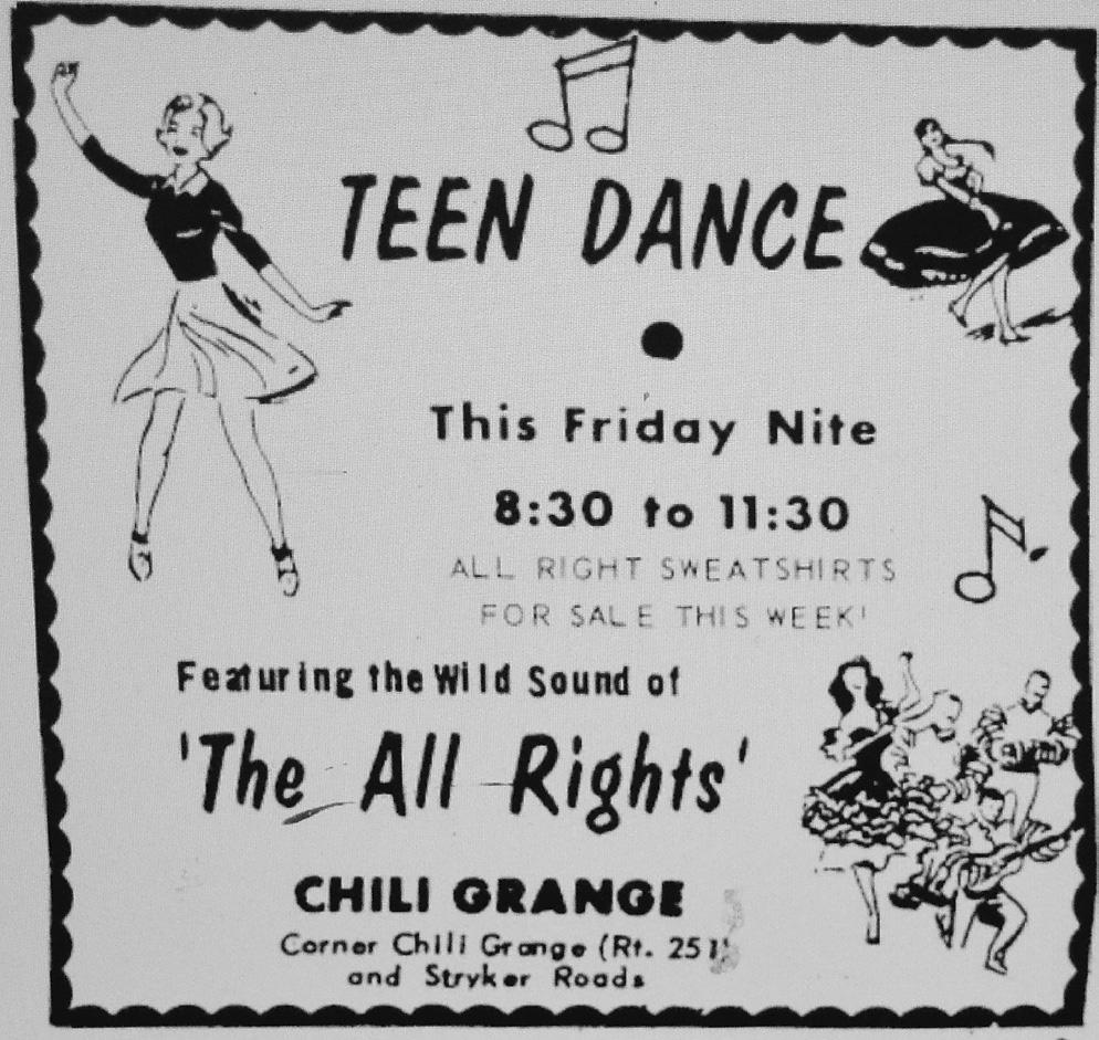 Teens mingling and dancing to the sounds of The All Rights at the Chili Grange where the band performed weekly. At left is a newspaper ad from that time. Provided photos.