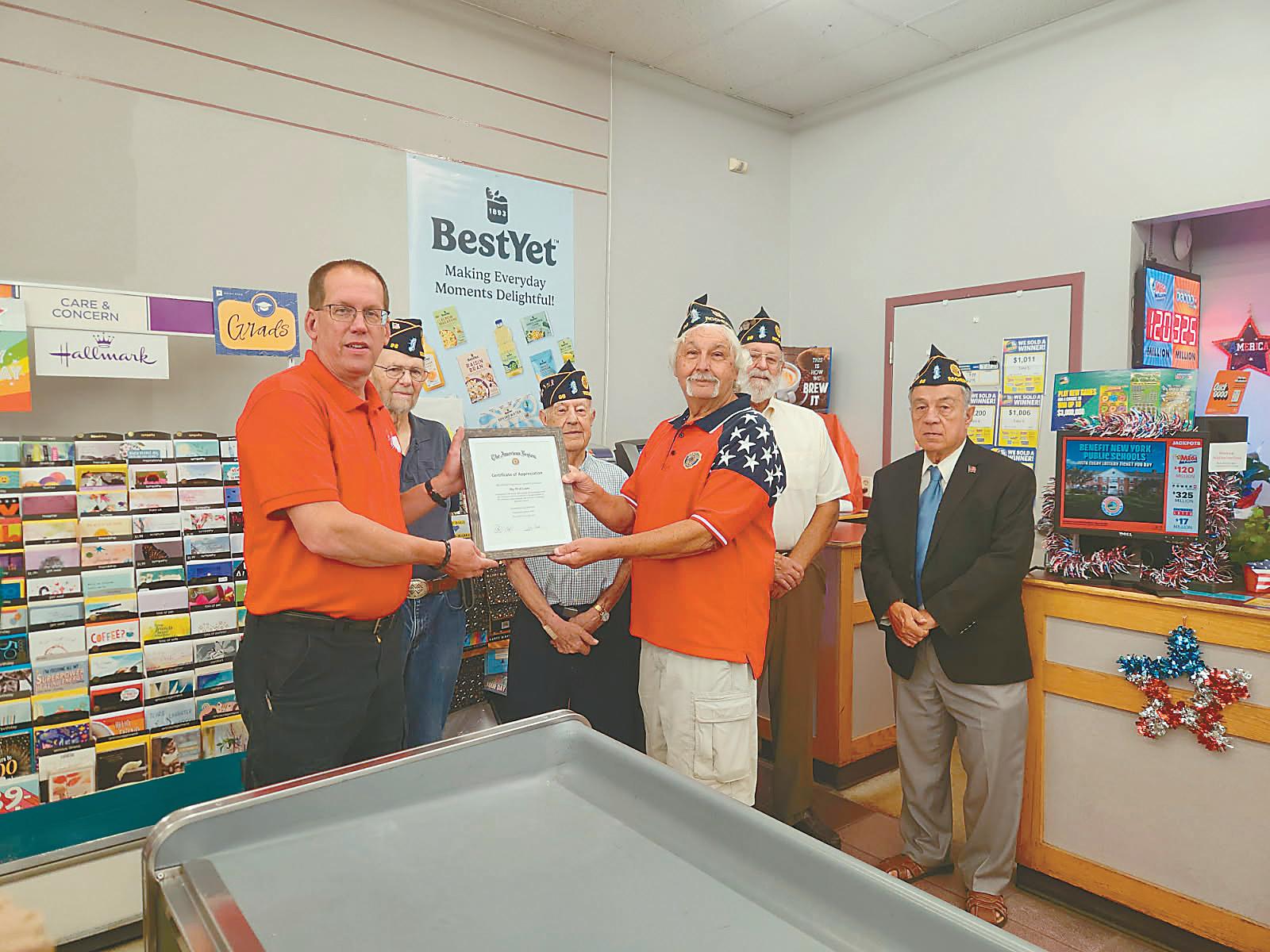 On Wednesday, July 23, members of the American Legion Doud Post #98 presented the owners of Big M Gates with a Certificate of Appreciation. Big M Gates has allowed members to sell poppies outside the store to raise money for American Legion programs. Pictured are: Greg Newman, owner of Big M Gates (not pictured owner Jon Spinder); and Legion members, John Roth, Rhuel McElhatten, Dale Demaison, John Noto, and Dick Lippa. Provided information and photo.