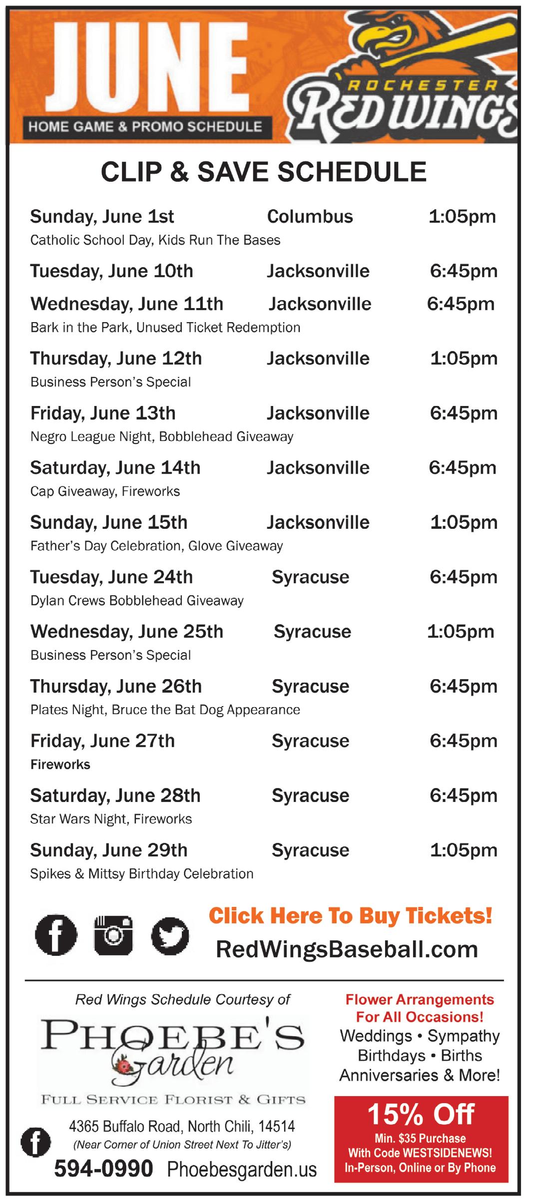 Visit milb.com/rochester for the Red Wings’ schedule and to purchase tickets. Provided information