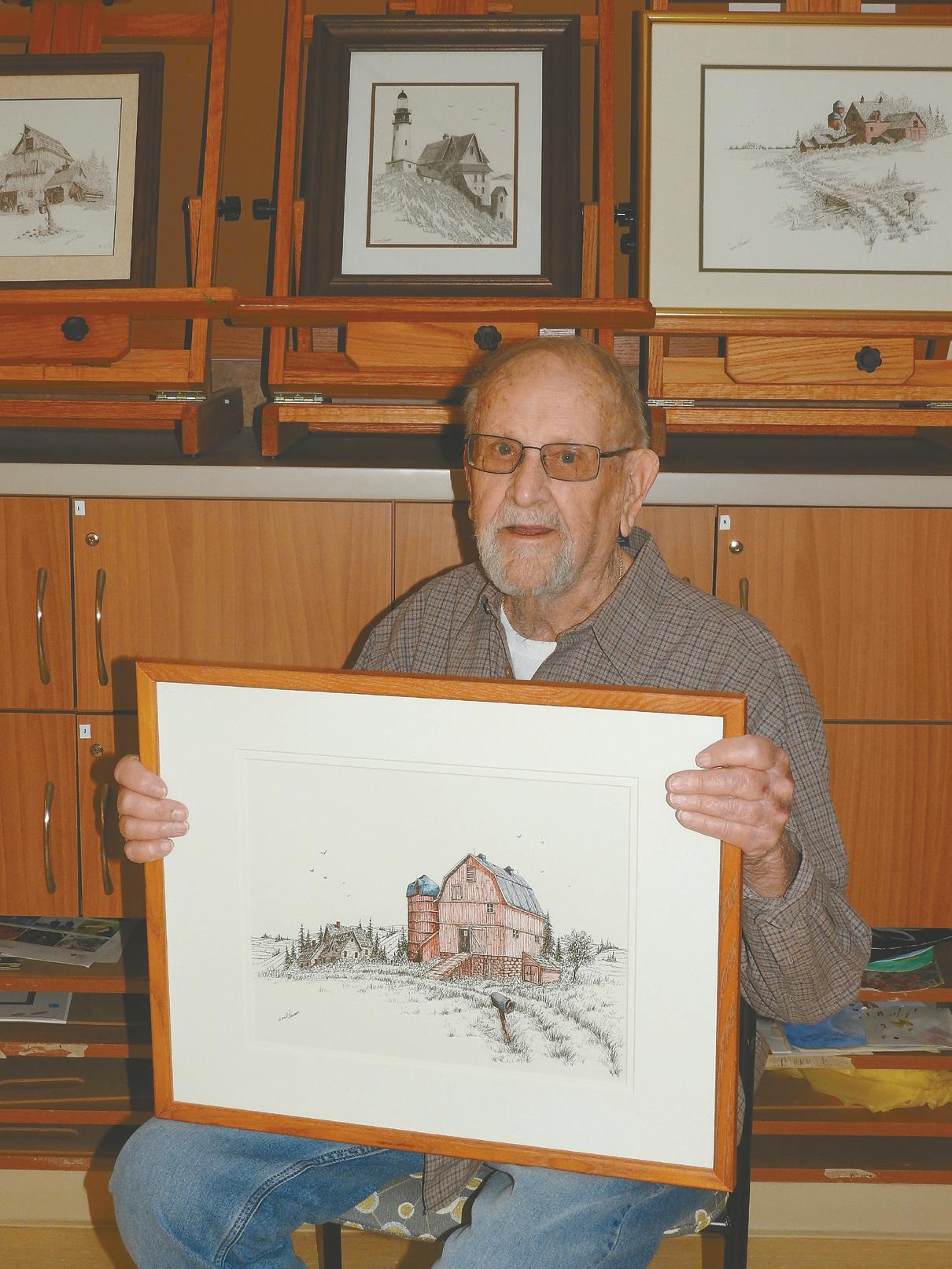 After his retirement, he went right to work creating artwork to sell at local outdoor art shows. He said, “I spent many summer weekends at art shows. I really enjoyed talking to the people that came in to buy my art, and I had many repeat customers.” At 97 years old, he still works every day for an hour or two in a studio sketching and adding details to his artwork.