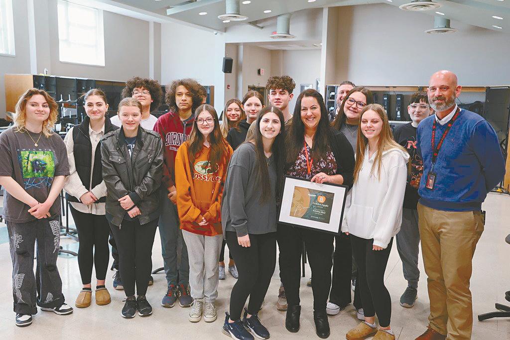 Hilton High School Music Teacher Kristina Best was surprised with the News 8 Golden Apple Award on April 9. She was nominated by students Ava and Alana who say, “Best in the best!” The segment will air on Tuesday, April 22, on News 8. Photos from @HiltonCSD on X.