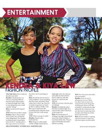 thigh high socks, Doc Martens and a plain tee shirt with the sleeves rolled up. I like this because it’s casual but still different. WSS: Do you have a favorite piece of clothing? Kendra: Probably the jacket that Kiya recently bought. It’s a raincoat that’s yellow with boats on the inside of it. Kiya: My favorite piece of clothing is my high-waisted black jeans from Urban Outfitters. I wear them all the time. They are super comfortable and match almost everything.
