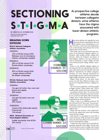 igh school athletes face arguably the most important decision regarding the future of their athletic career: committing to a college. This choice comes with many implications, such as determining what division level of the program they want to attend. Most public and 4-year universities have programs in the National Collegiate Athletic Association, while smaller, private colleges have divisions within the National Association of Intercollegiate Athletics. Two-year institutions, such as community or junior colleges, are part of the National Junior College Athletic Association. Home to over 400,000 collegiate athletes in the nation, the NCAA is divided into three divisions, abbreviated as DI, DII and DIII, each with different requirements for athletic programs. Divisions are most distinctly determined by school budget and size, with DI schools having a higher budget and greater variety of sports. Miguel Cohen Suarez ’22, who plays varsity soccer, sees that these differences bring a varying level of competition between collegiate divisions. “DI is the most competitive, and that’s usually at bigger schools,” Cohen Suarez said. “DIII is usually smaller schools and is less competitive.” According to Peyton Steva ’19, who ran track at DI University of Northern Iowa and currently runs at NJCAA DII Indian Hills Community College, there is little distinction between the competitiveness of these programs. “There is little to no difference between DI, DII, DIII and JUCO,” Steva said. “Everyone participating in a sport, no matter the level, is there because they want to be a part of that sport at the highest level.” Along with this decision, some student-athletes face the stigma that comes with attending a lower division college. Nola Femino ’21 committed to swim DIII at Calvin University. While she believes the stigma exists, she finds that athletes have personal reasons for choosing their college. “I think that a lot of times, DI is extremely demanding, especially with college,” Femino said. “I’m just excited to swim in college, and I wanted to have a balance between college and social life